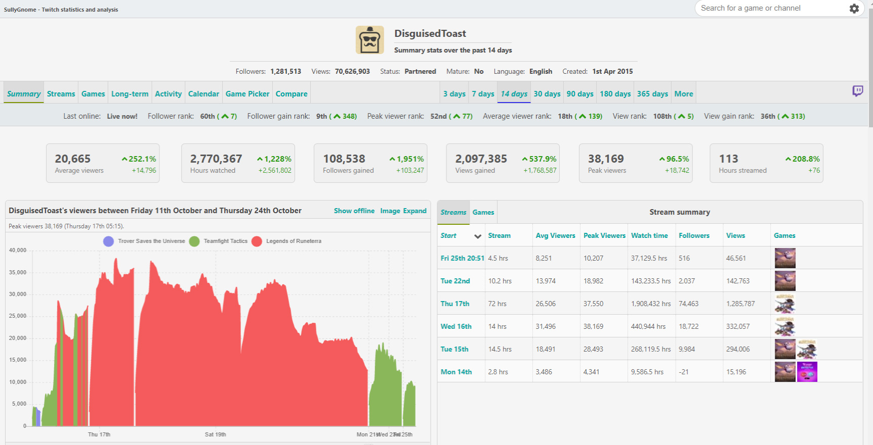 SullyGnome’s Summary page for DisguisedToast over the past 14 days. This analytics tool gives you helpful information about your Twitch channel’s stats and trends.