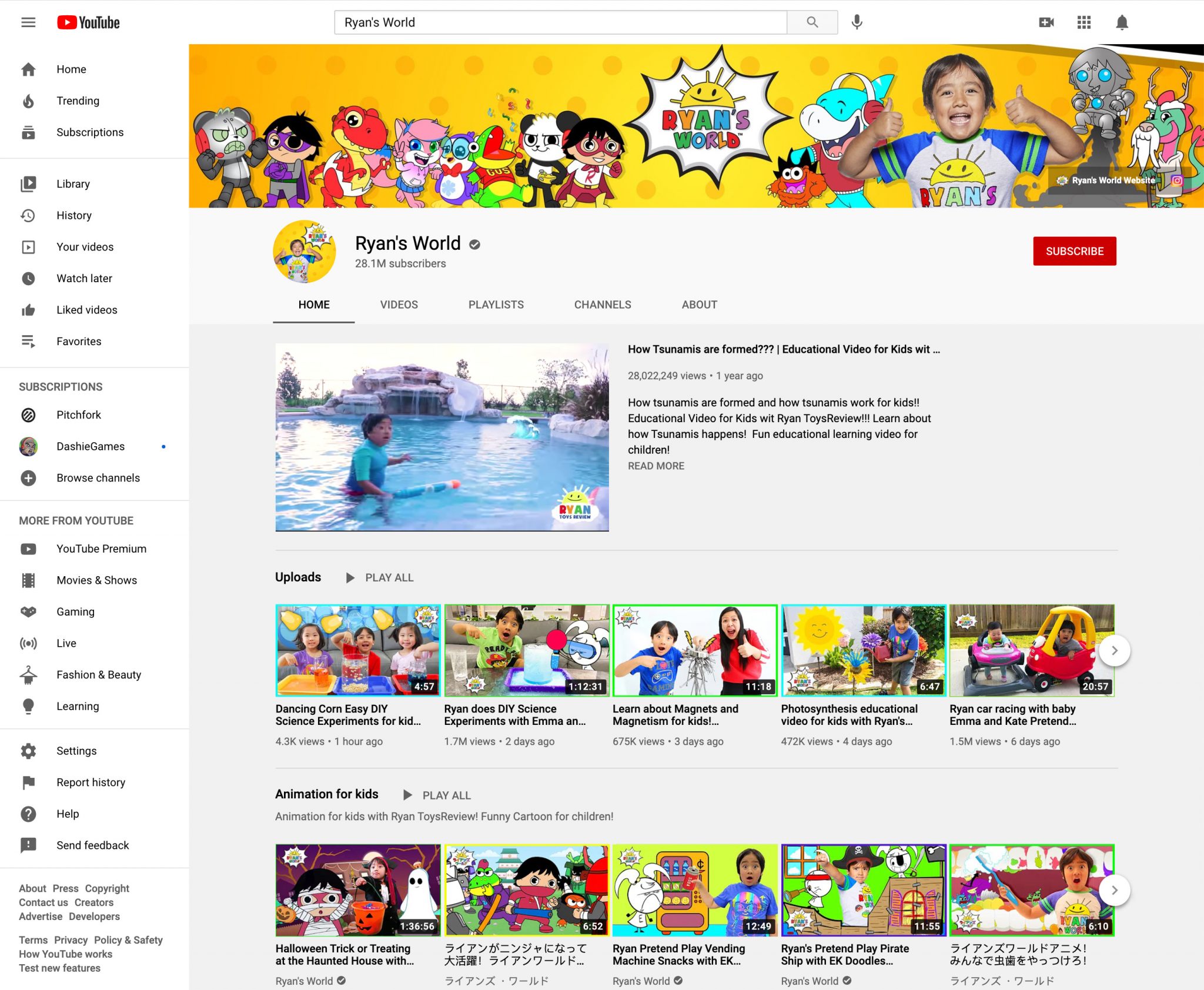 Ryan Kaji is a kid influencer who posts videos of toy unboxings, product reviews, science experiments, DIY crafts and more on his channel Ryan’s World. Ryan has four banner links. The first leads to his family’s YouTube channel where his mom, dad and twin sisters post content about their daily life. The second is a collection of Ryan’s popular YouTube videos that contain giant egg surprise toys content, which collectively have over 135 million views.