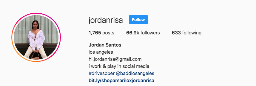 Jordan Santos “works and plays in social media.” She uses her lnstagram presence to share fashion, food and lifestyle images and to promote the message to stop drink driving. She has 61,200 followers.