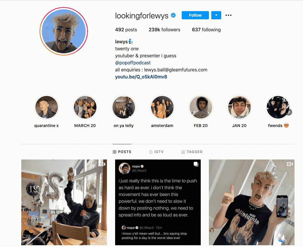 In 2017, Lewys Ball became the first male face of Rimmel cosmetics while he was still a teenager. His career has gone from strength to strength and, at the age of 20, he has a following on Instagram in excess of 228,000. He also has a YouTube channel with 419,000 subscribers.