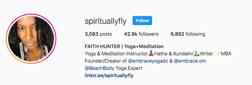After his uncle passed away, Townsel felt inspired to work as an educator and help others benefit from mindfulness and yoga. Now an international yoga instructor, Townsel uses his Instagram account, @dade2shelby, to show off his moves and share information about upcoming retreats. He has more than 98.7K followers on the image-sharing platform. He also offers content on Facebook, where he has more than 6K followers.